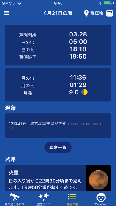 「毎日の暦」では日の出、日の入り、星座がよく見える時間といった情報が記載されています。事前にこちらの情報を確認し、どの星座や惑星を見るか決めておくと効率的。夜の限られた時間でも、スムーズな星空観測の備えになります。