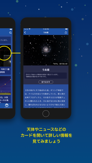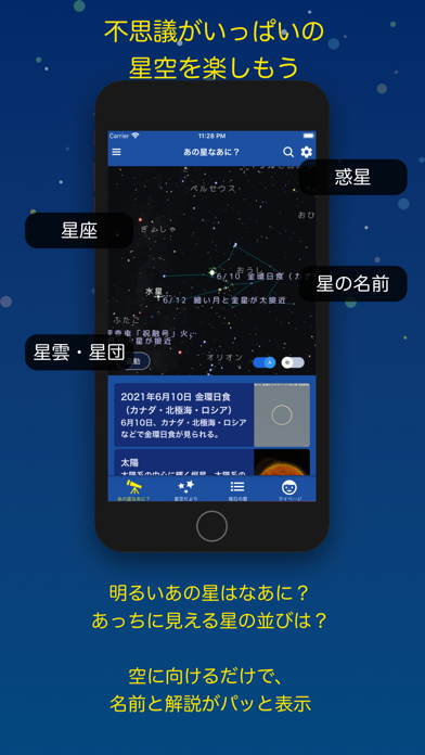 スマホのカメラを向けると、いまその方角に存在する星座が表示されます。なお昼でも使用可能。気になる星座があれば、その場で解説を開けます。神話にまつわるエピソードや、実際の撮影写真が掲載。また星座のほか、惑星、星団、星雲の情報も収録されています。