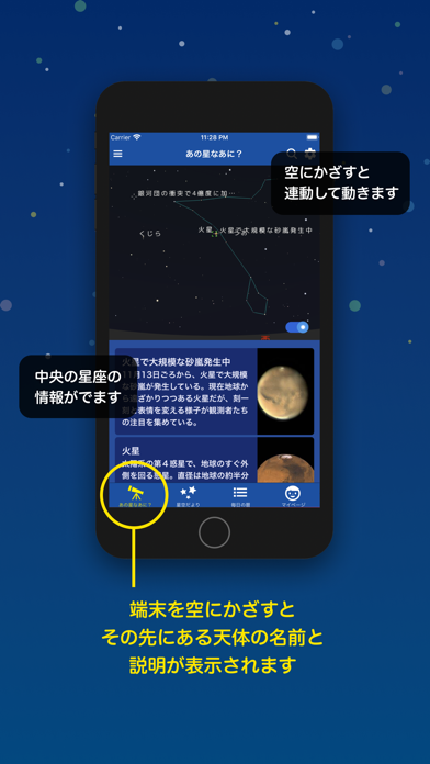 - カメラを向けると今見える星座がすぐわかる。神話もいっしょに確認