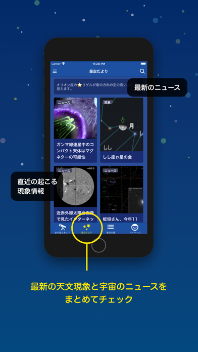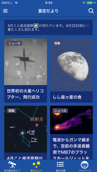 「星空だより」では天文に関するニュースが配信されています。本アプリの観測機能と連動しているのも特徴。