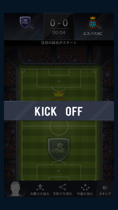 試合を観ながら指示を出すことができます。出せる指示は「攻撃力を強化」「支配力を強化」「守備を強化」の3種類。指示を出すときは該当する項目をタップするだけなので、とても簡単です。監督視点で試合に参戦するという一味違った楽しみを体験できます。