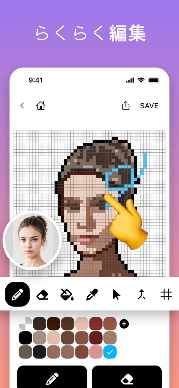 ドット絵作成の手軽さが魅力の加工アプリ。AIが生成する下絵を利用し、初心者でも簡単にドット絵を描けます。また指で画面をなぞるとカーソルが移動し、ドットを打ちたい箇所にカーソルを合わせ、ボタンを押すだけでドットが打てます。絵を描くことが苦手な人や、ドット絵初心者にもおすすめですよ。