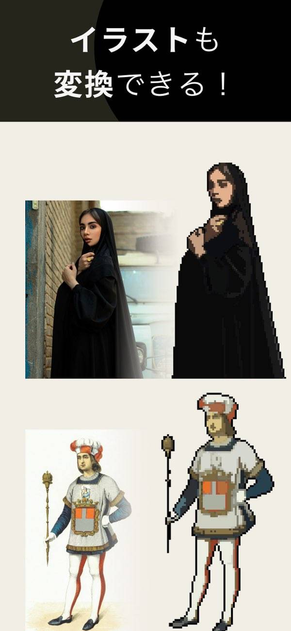 本アプリではイラストを瞬時にドット絵へと変換することも可能。こうした機能を使えば、自分の描いたイラストや好きな画像を元に、オリジナルのドット絵を作成することができます。創造力を最大限に引き出し、あなただけのアート作品を生み出してみませんか?