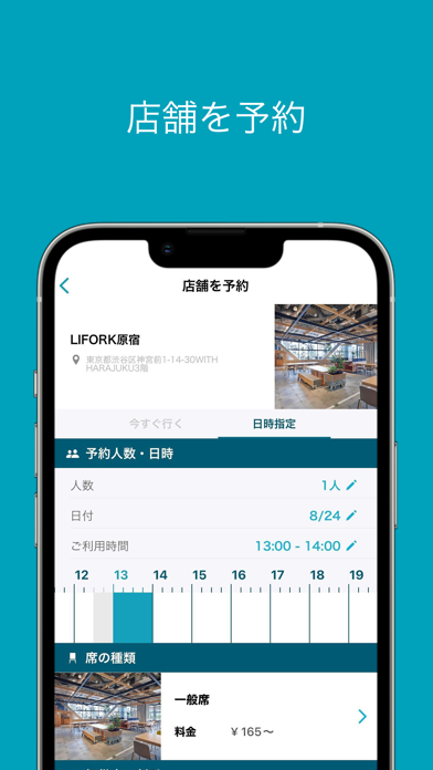 現在地から近くのワークスペースを検索・予約できるアプリです。地図上から近くのワークスペースを見つけて、利用人数や利用日時を入力すれば予約が完了。