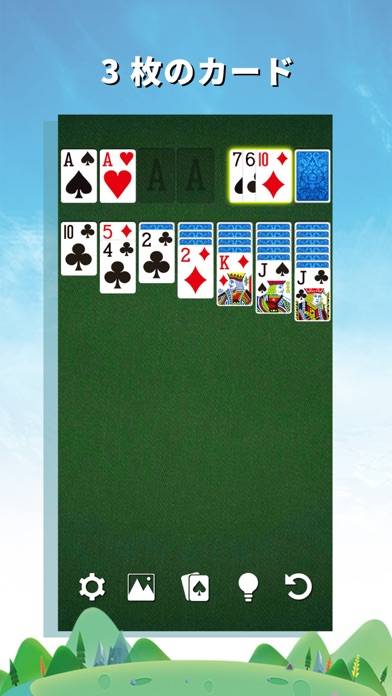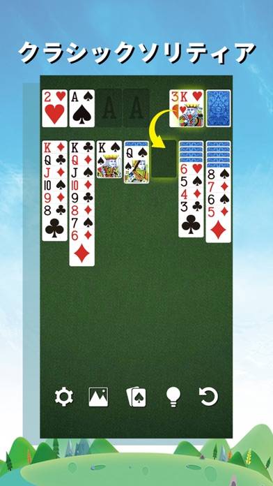 オーソドックスなソリティアで遊べます。操作は類似アプリと変わらず、説明が無くとも直感的に遊べるでしょう。画面下部には電球マークのヒント機能、その右隣にアンドゥ(一手戻る)機能があり、行き詰ってもリカバリーしやすいです。
