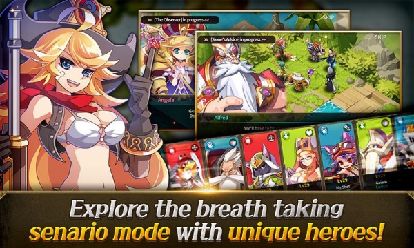 通常攻撃の概念がなく、キャラ毎に異なる範囲攻撃スキルを使って戦えるのが特徴。類似アプリでは移動から攻撃対象の選択などひとつひとつ操作が必要なモノが多いですが、本アプリではスキルを選ぶだけで対象を指定して移動、攻撃可能であれば自動で攻撃までしてくれます。少ない操作でバトルを進行させられるためテンポよく遊べますよ。
