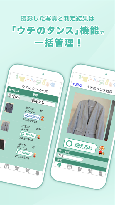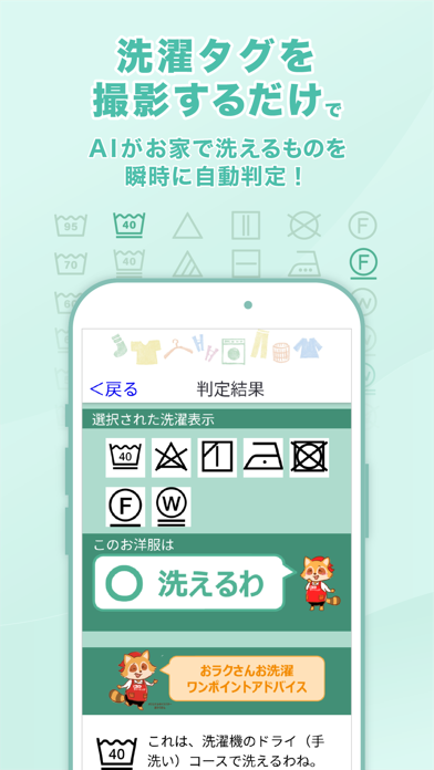 服の洗濯表示を見てもピンと来ないときに頼れる洗濯サポートアプリです。洗濯タグを撮影するとマークを自動で読み取り、洗濯、乾燥機、アイロンの可否などを表示。服を縮ませてしまったり、色落ちしたりといった失敗が少なくなります。