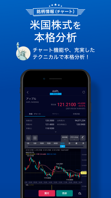 米国株の取引をよりスムーズに行えるSBI証券の株アプリです。「テーマ」「キーワード」「スクリーナー」を使って、興味のある銘柄を簡単に検索できます。また、豊富なテクニカル指標を用いたチャート分析機能が搭載されており、詳細なトレンド分析が可能。さらに、米国株の決算情報をすぐに受け取れるのも魅力です。