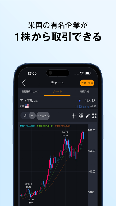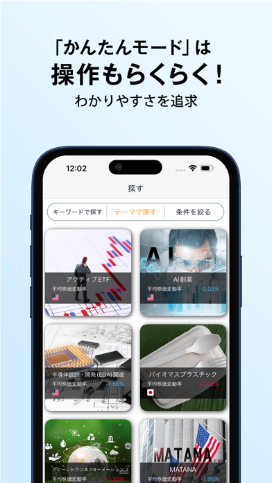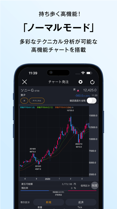 2モードで表示を切り替えられる株取引アプリ。詳しい値動きや分析が見られる“ノーマルモード”と、シンプルなデザインで手軽に操作できる“かんたんモード”を搭載しています。