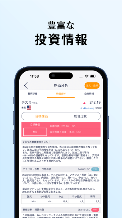 - 単に株価を表示するだけでなく、アナリストによる分析も見られる
