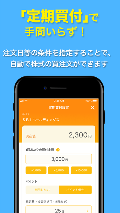 - 定期買付の設定が可能。指定した期日に株を自動で買い足せる