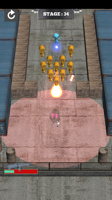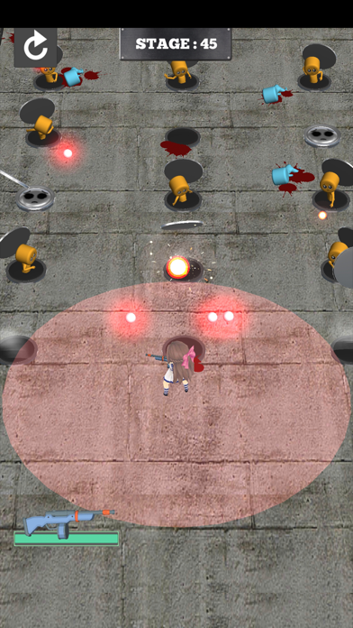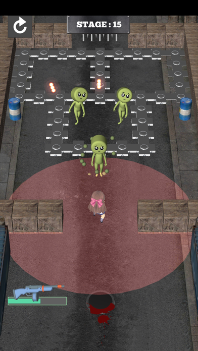 ▲停止時に赤い範囲内の敵を自動攻撃。立ち回りを考えないとぴえんに触られ即ゲームオーバーだ。