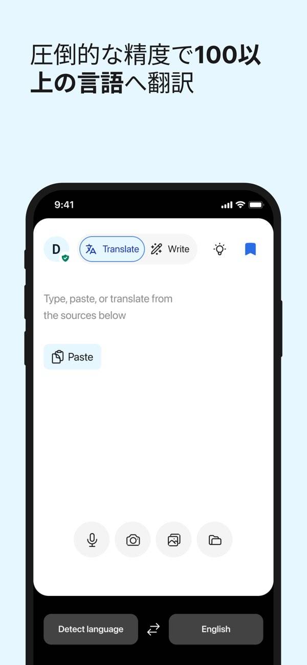 入力したテキストを別の言語に訳してくれる翻訳ツール。日常的な言い回しや慣用句といった、ほかのツールでは上手く訳せない表現も柔軟に対応し、自然な文章に翻訳してくれるのが特徴です。カメラで紙の文章を読み取ったり、マイクで音声入力したりと、入力サポート機能も充実しています。