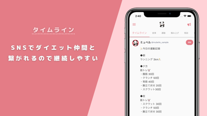 体重や食事の記録とSNS機能を組み合わせたアプリ。タイムラインやいいね、コメントなど、同じ目標を持つ仲間と励まし合うことで、ダイエットのモチベーションを高められます。