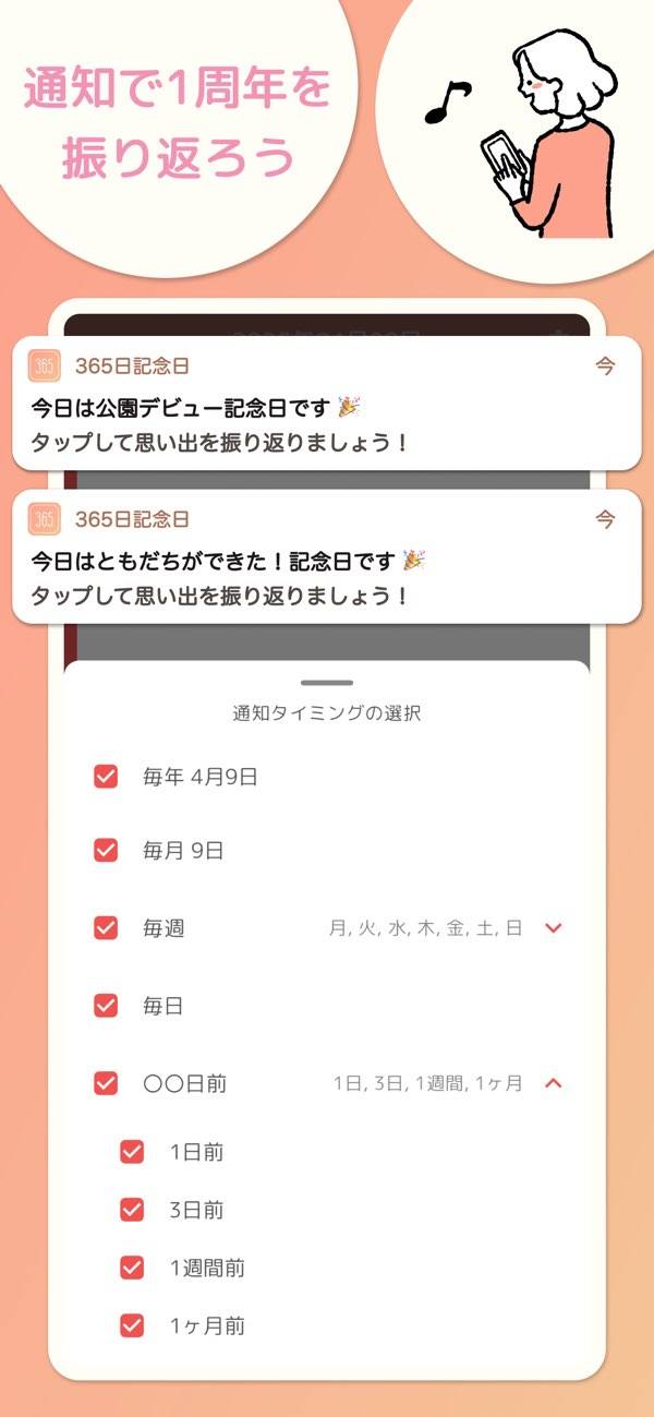 このアプリでは、日常の出来事を記念日として大切に記録できます。例えば、子供の成長の瞬間であったり、初めて訪れたカフェであったり。小さな出来事からイベント事まで自由につづれます。