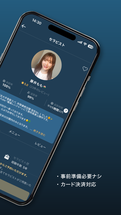 セラピストは、全員が運営会社による面談を経て選ばれたプロばかり。安全で質の高いサービスを受けられるため、初めての方でも安心。経験年数やレビュー、自己紹介も参考になります。気にいったセラピストはお気に入り登録できます。