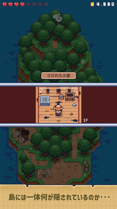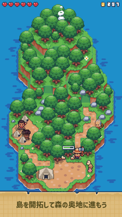 木や石などの素材を集め、その素材を利用して斧などのアイテムを作成。作ったアイテムは強化することでレベルが上がり、島の奥へと進めるようになります。
