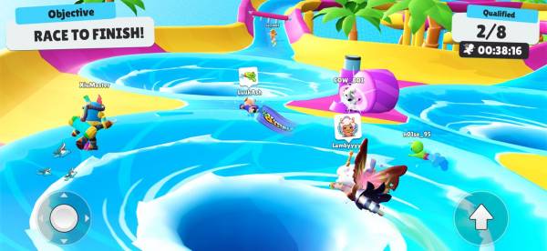 最大32人で対戦できるオンラインパーティーゲーム。操作はバーチャルパッドを使用し、移動&ジャンプのみなので気軽に遊べます。ステージはランダムで決まりますが、ルールは「ゴールを目指す」「ステージから落ちるな」といったシンプルなものばかり。