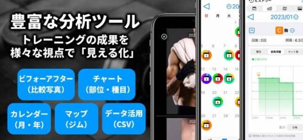 負荷や運動の量を見やすいグラフで振り返りることができます。日々の頑張りが可視化されるので、プランの見直しがしやすく続けるモチベーションにもなるでしょう。部位や種目ごとに細かく確認できるのも嬉しいところです。