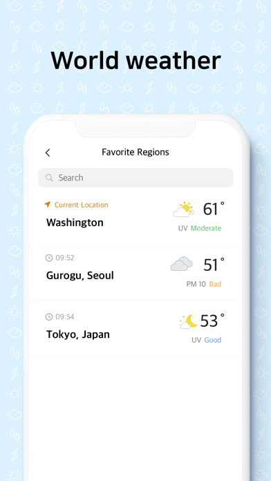 前日との気温差や体感温度もわかるのが特徴。現在の天気をイラストで表示してくれるのはもちろん、背景と現在の天気が連動されるため、ひと目で天気が確認できます。シンプルなUIで使いやすいのが嬉しいですね。