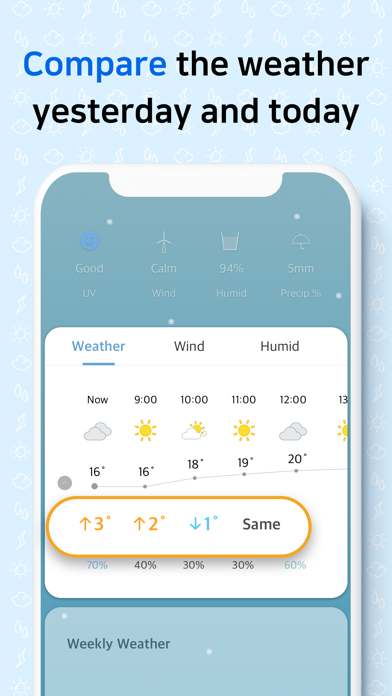 - 天気&気温を前日と比較。温度や風速、湿度など詳細情報もわかる