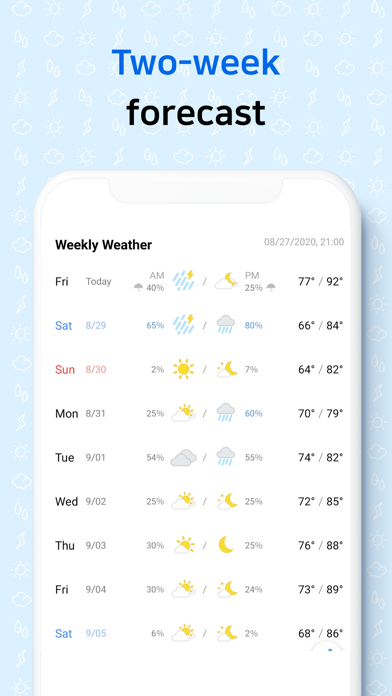 前日との気温差や体感温度もわかるのが特徴。現在の天気をイラストで表示してくれるのはもちろん、背景と現在の天気が連動されるため、ひと目で天気が確認できます。シンプルなUIで使いやすいのが嬉しいですね。