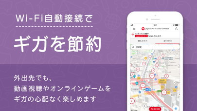 GPSを通じて近くのスポットを探せます。1回の接続につき何分使えるか、回数制限はあるかなど詳細も表示。また経路も地図上に表示してくれるため、すぐWi-Fiスポットへ迎えます。