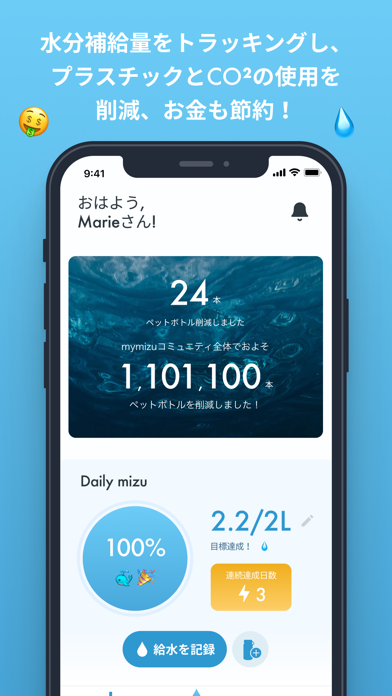 - 毎日の水分補給量に応じて、ペットボトルやCO2の削減量を可視化