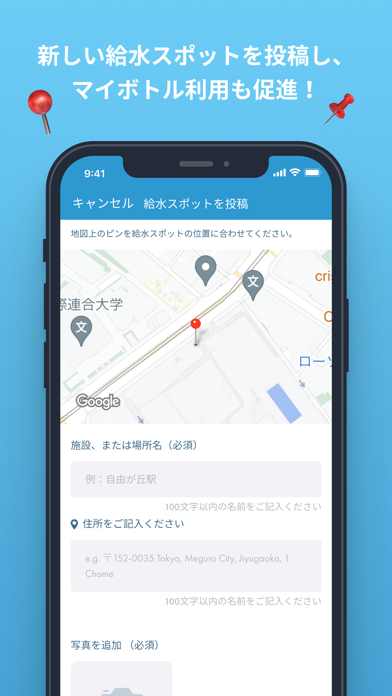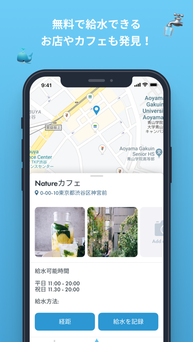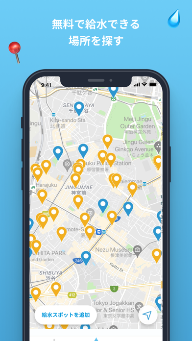 - 近くの給水スポットをマップに表示。外出中に水分補給ができる