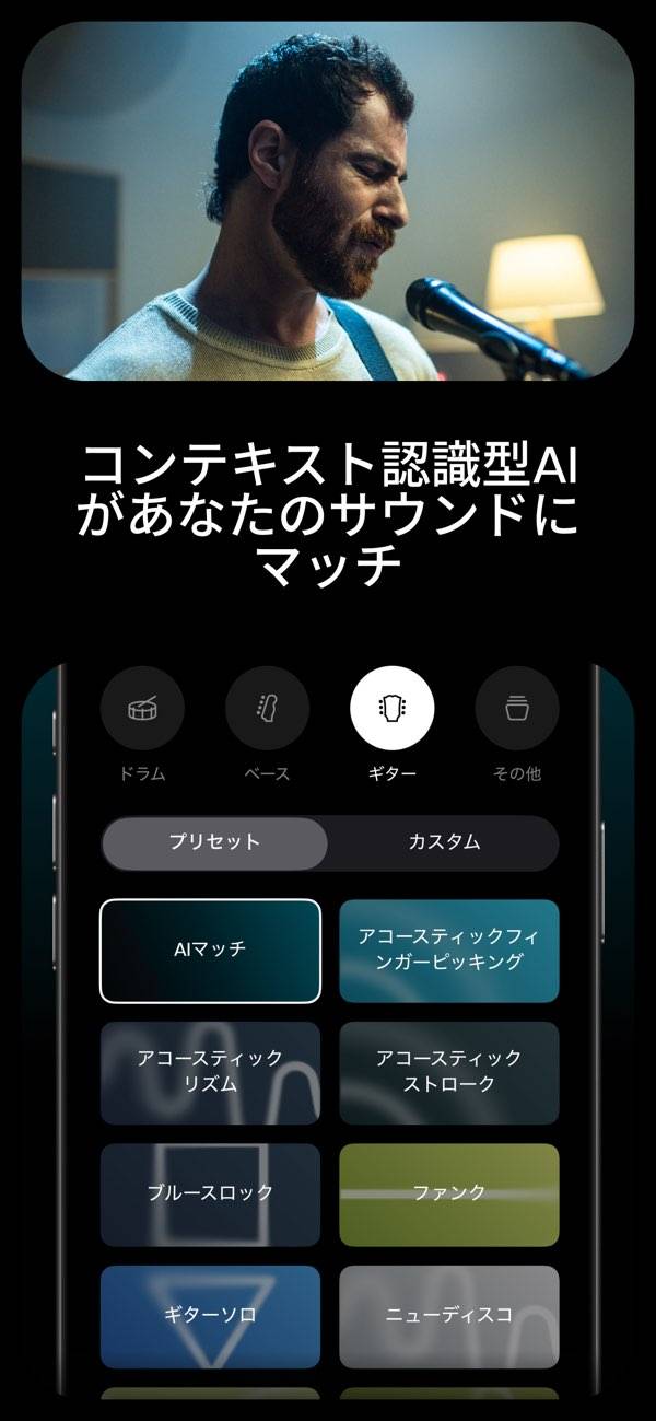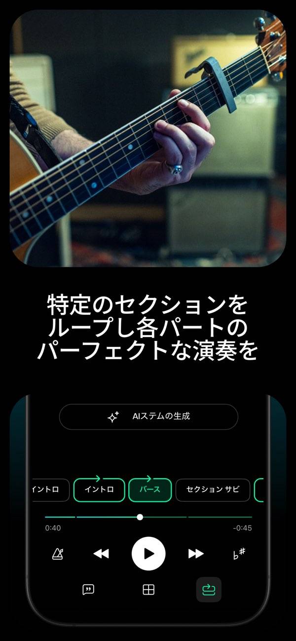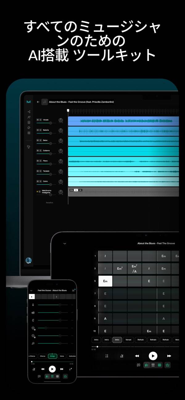 好きな曲の中からボーカルやギターなどの音を分けて、自分のペースで演奏練習できる音楽プレーヤー。AIが自動でコードを表示してくれるから楽器初心者でも曲を追いやすく、メトロノームやピッチ変更で細かい調整も可能。耳で聴くだけの練習から、目で確認しながら弾いていく練習へ変えられます。