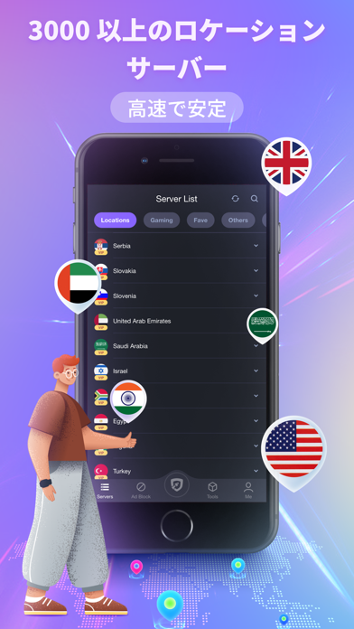 世界中のあらゆる場所から、安全にインターネットへの接続が可能です。これにより、地域によるウェブのアクセス制限を回避し、地理的な制約を受けずにウェブ閲覧を行えます。またゲーム用サーバーもあるのでスマホゲーマーにもピッタリ。