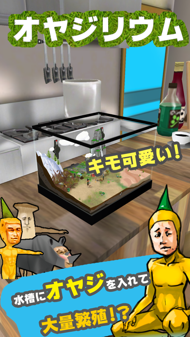 水槽の中で様々な「オヤジ」達を育てていく育成ゲーム。デコレーションをしたり、設備をアップグレードさせたりしていくと、飼育レベルがアップしていきます。また条件を満たすことで、「怪我したオヤジ」や「ピンクオヤジ」など新種を発見しやすくなるのが特徴。