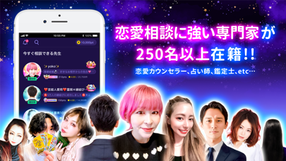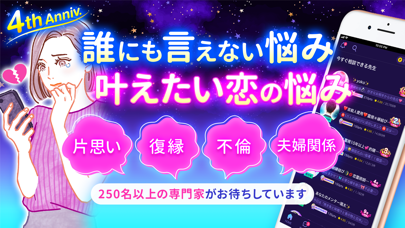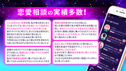 復縁、不倫、浮気、夫婦関係といった悩みをメインに鑑定してくれる占いアプリです。お悩みシートを書き込むと10人程の占い師から、すぐにコンタクトが飛んできます。占い師ごとに書かれたユーザーレビューを参考に、誰に占ってもらうか選択。