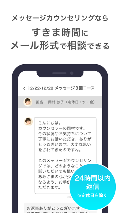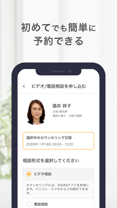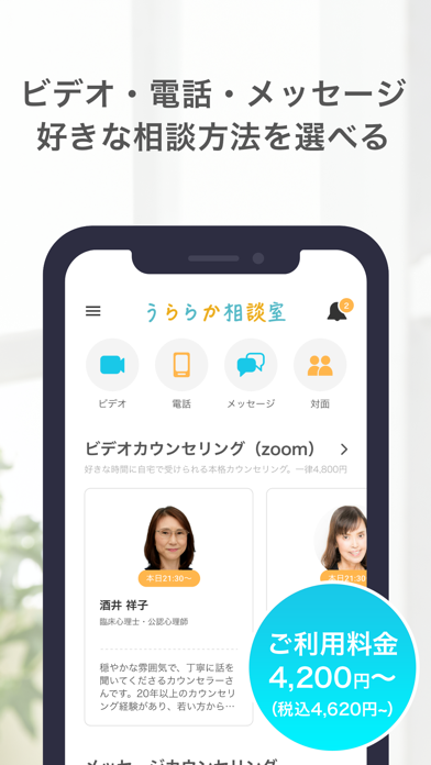 - ビデオ、電話、メッセージ、対面の中から好きな相談方式が選べる