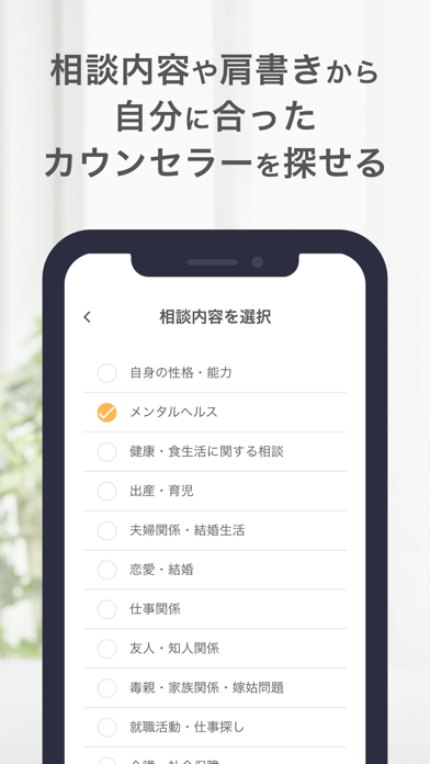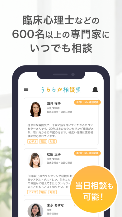 あなたに合った専門家に相談できる。このアプリでは、600人以上の専門家が登録されています。それぞれが臨床心理士や社会福祉士などの国家資格を持つプロフェッショナル。だからこそ、あなたの悩みに対して的確なアドバイスが期待できます。