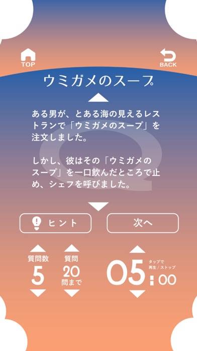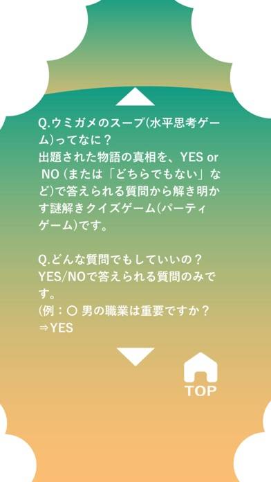 「ウミガメのスープ」で知られる、水平思考クイズを遊べるアプリ。「ウミガメのスープを飲んだ男は崖から飛び降りて死んでしまった」などの不思議な物語の真相を、「はい」「いいえ」で答えられる質問を通して推理するゲームです。