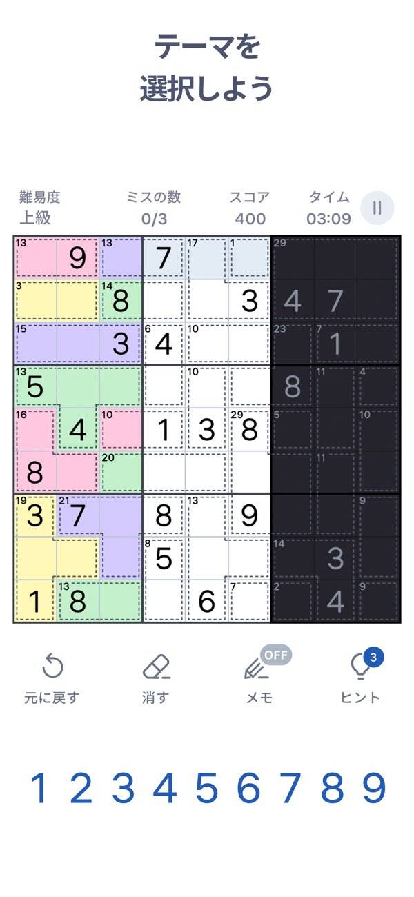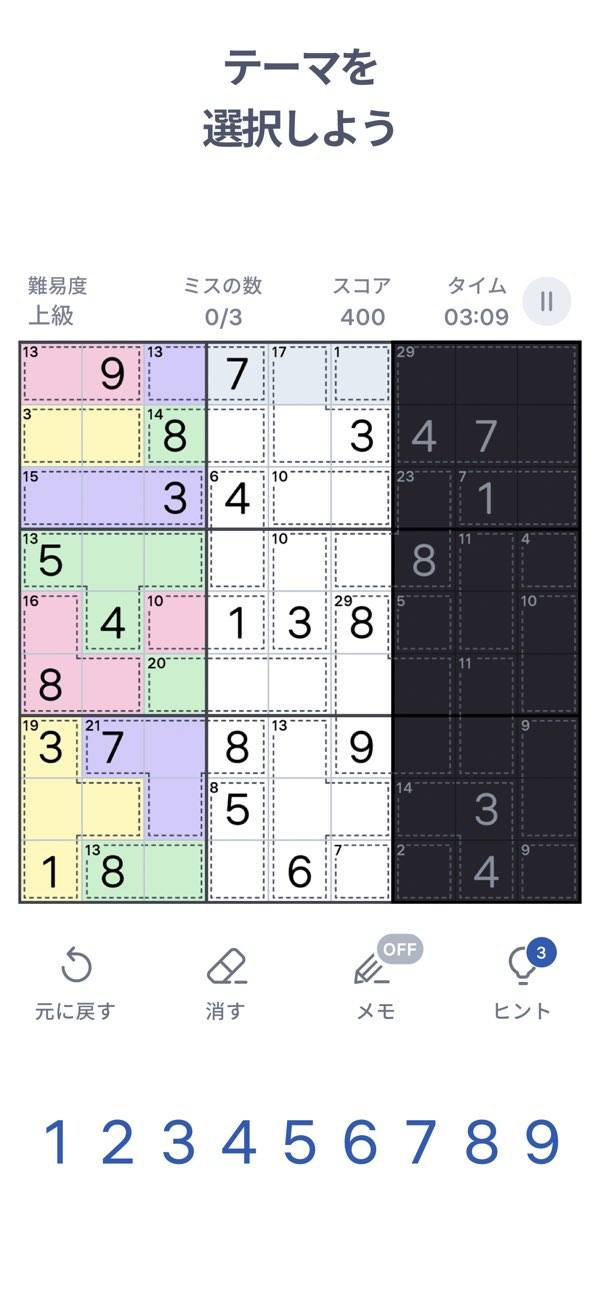 明、暗、セピアなどのカラーテーマを選択・調整することができます。テーマを変更して、気分を新たにナンプレに挑戦しましょう。また、設定で細かくカスタマイズも可能。慣れている方は間違いの上限をONにして楽しむのもいいかも。