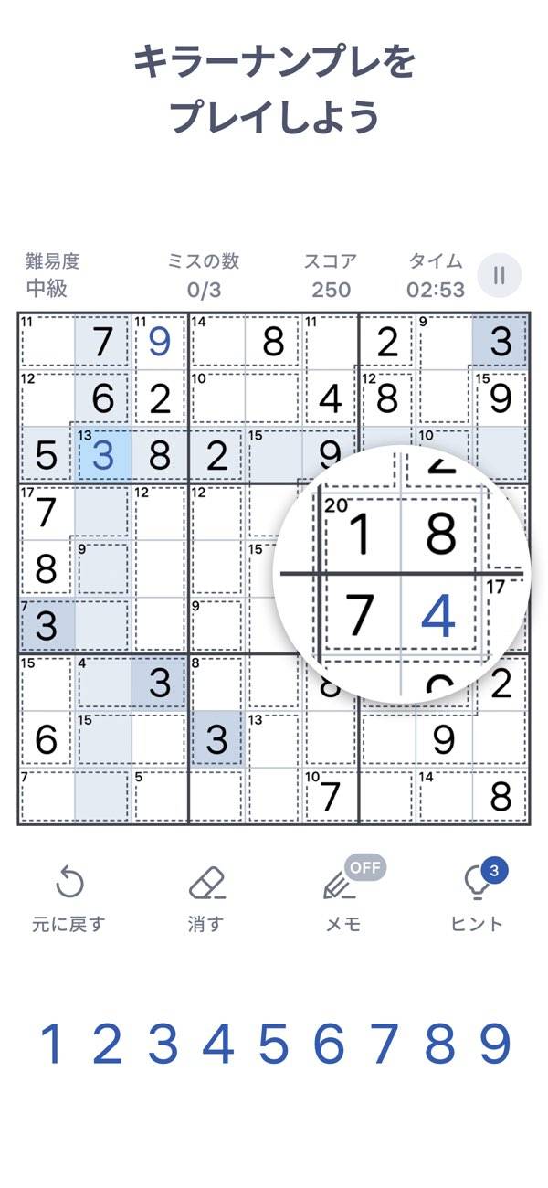 全体的にデザインはシンプルで見やすくまとまっています。そのシンプルさが功を奏してか、計算に集中できるのがうれしいポイントです。数字はタップで記入し、自動保存や消しゴム機能なども搭載しており、ナンプレ好きには大満足の仕様になっています。