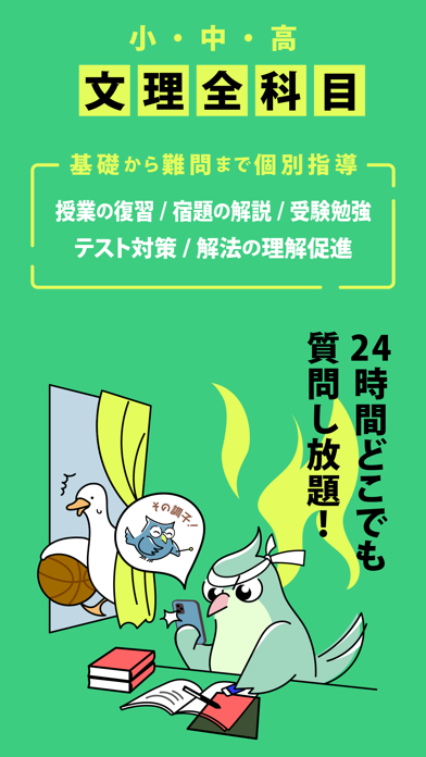 勉強中に出てきた疑問を写真や文字で投稿するだけで、先生から丁寧な解説が返ってきます。小学生・中学生・高校生の全学年に対応していて、国語・数学・英語・理科などすべての教科の質問が可能。しかも、1つの質問に対して解決できるまで何度でもやりとりできるので、安心して納得いくまで質問が続けられます。