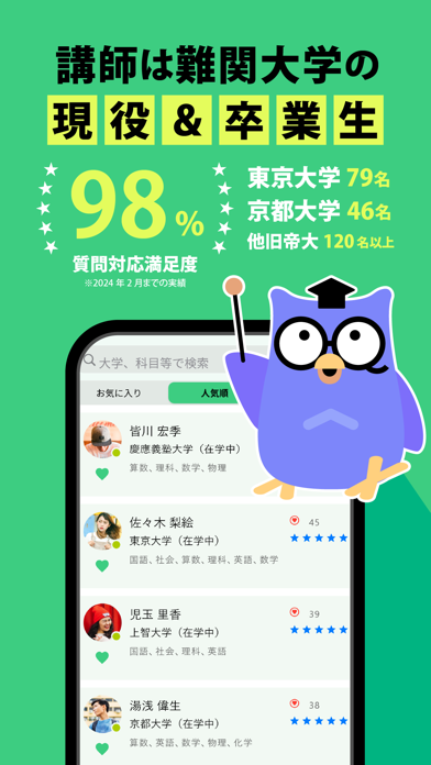 一度やりとりして「この先生わかりやすい!」と思ったら、次回から指名して質問することができます。東大などの難関大学に通う学生やプロの講師多数とチャット形式でやりとり。教え方や雰囲気が合う先生に繰り返し聞けるから、よりわかりやすく、自分のペースに合った学び方ができますよ。