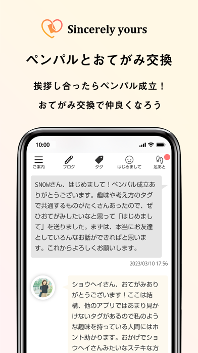 まずは「おてがみを交換する仲」としてゆるやかにスタート。恋人や結婚相手を前提とせず、趣味友達や食事友達など、お互いの関係性を自由に築けます。相性が合わないと感じた場合は自然消滅機能で気まずさなく解消できるため、考えすぎずに始めやすいです。