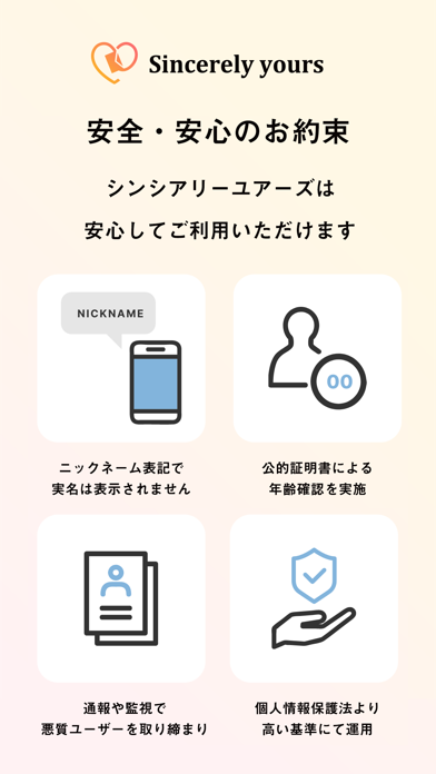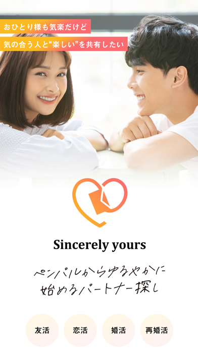 「結婚」「恋愛」という枠にとらわれず、出会いをもっと自由に楽しめるアプリ。「はじめまして」から始まり、お互いの関係性を自然に築いていけます。もちろん、本人確認や運営による監視など、安心して利用できる環境も整っています。まずは友達からゆっくり始めたいという人にぴったりなマッチングアプリです。