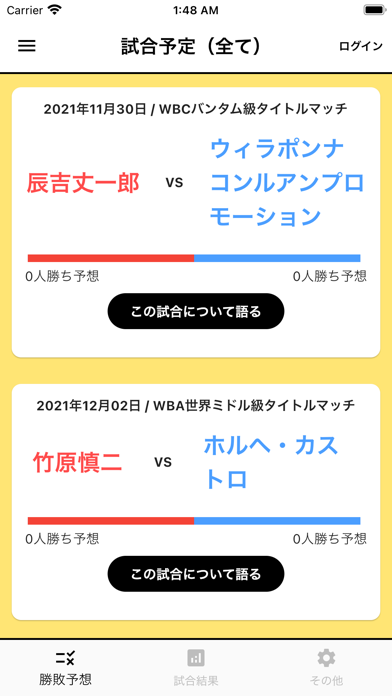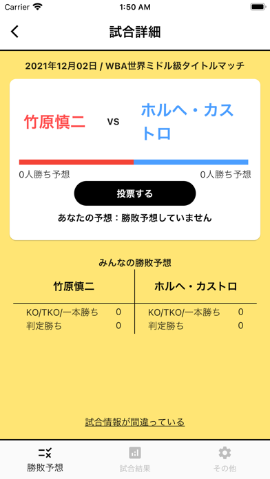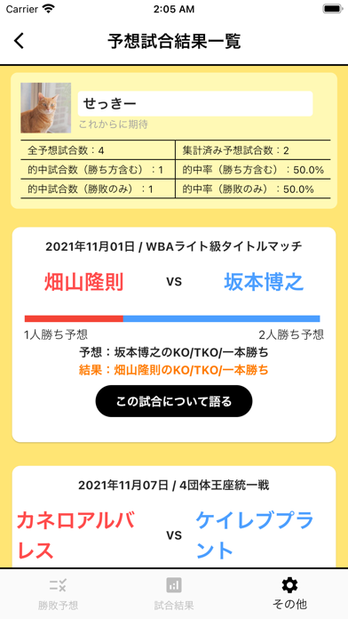 開催予定試合の勝敗結果を予想して投票できます。勝ち負け以外にも、KO勝ちや判定勝ちのようにさらに詳しい予想が可能です。みんなの予想も帯グラフを見れば一目瞭然。試合情報は自分で追加できるので、気になる試合の枠がないときは追加しましょう。