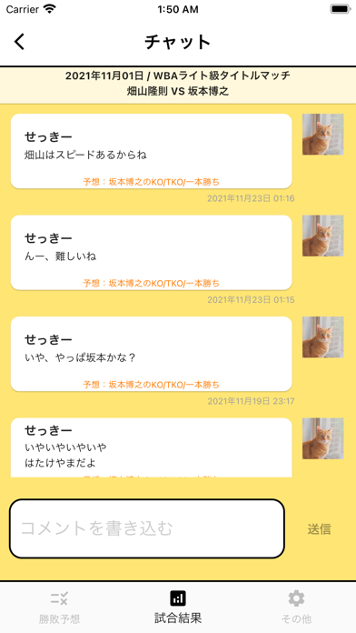 試合の予想や結果について語れるチャット欄