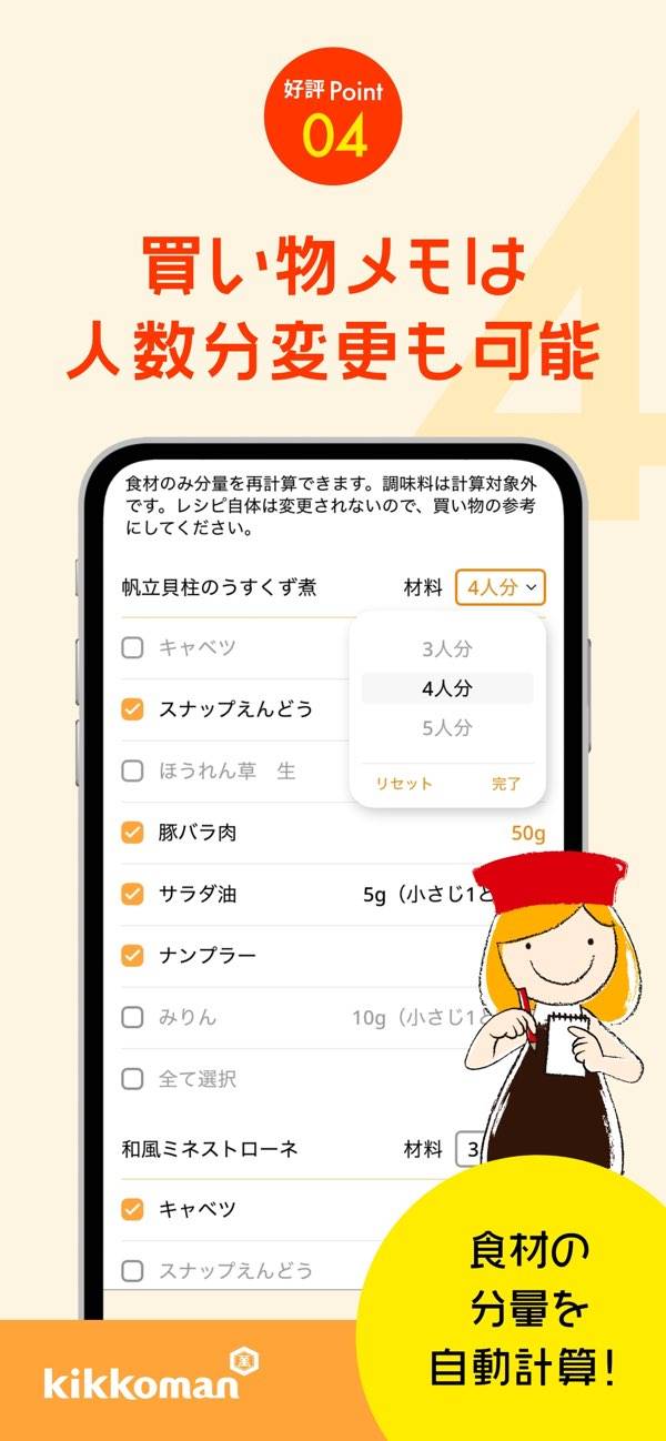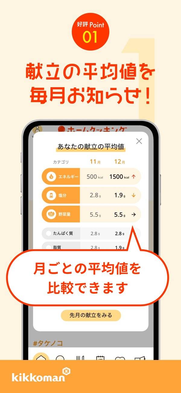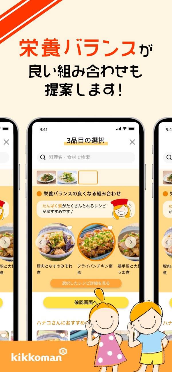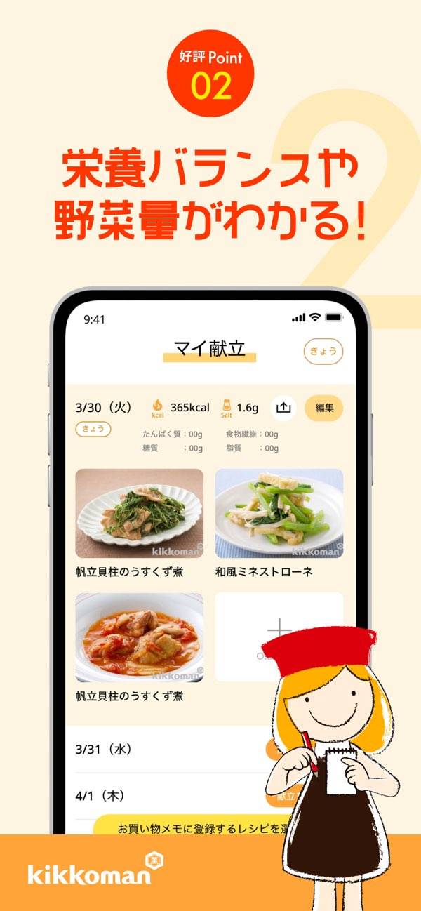 季節や栄養バランスを考えた献立を提案してくれます。詳しいレシピと共に、調理にかかる時間・カロリー・塩分などを表示。使う調味料はキッコーマンの商品が多く、同じ調味料を使えば味に偏りが出にくいでしょう。