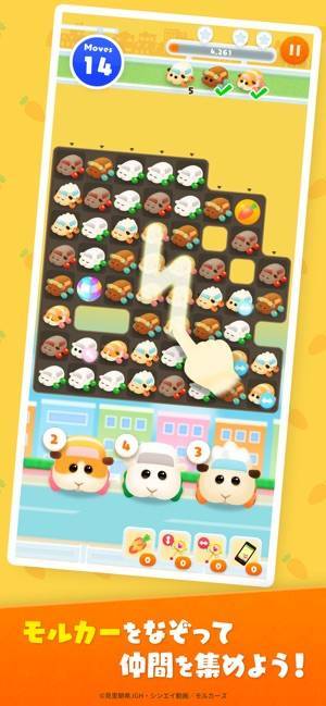 同じモルカーを3つ以上つなげてなぞるだけの簡単操作。モルカーたちと協力しながら、ステージごとに出される課題をクリアしていきましょう。繋げるたびにモルカーたちが鳴くのもポイント。