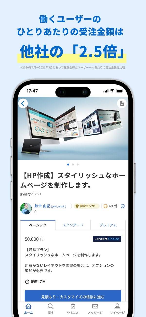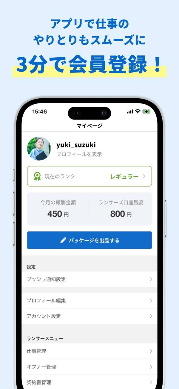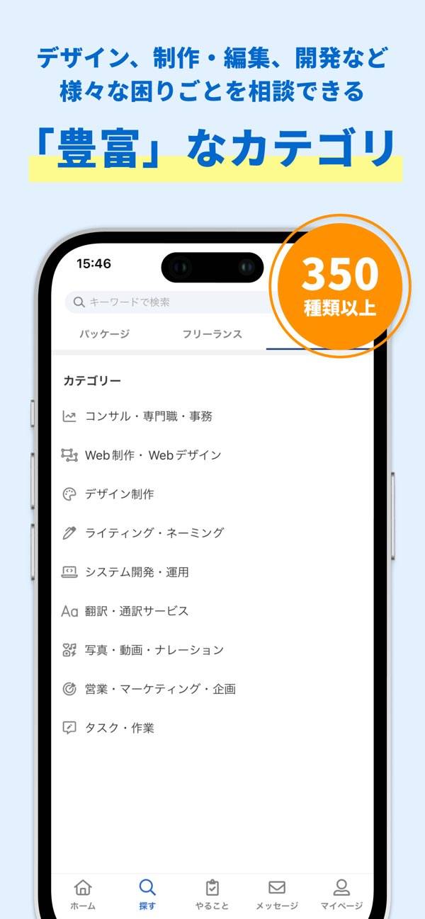 依頼前の相談から、受けた後の確認まで、やりとりをアプリ内のメッセージで進められます。文章で要点を残しながら話を進められるので、「何をいつまでにしたらいいのか」が整理しやすくなります。パソコンを開けない時間でも返信でき、テンポよく話が進むことで受注につながるのがメリットです。