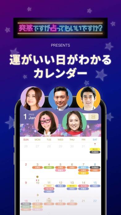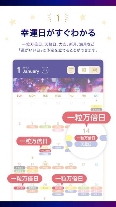 フジテレビ系水曜よる10時~放送中 「突然ですが占ってもいいですか?」発のカレンダーアプリ(2022年1月4日現在)。一粒万倍日、天赦日、大安、満月など幸運日がひと目わかります。