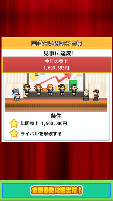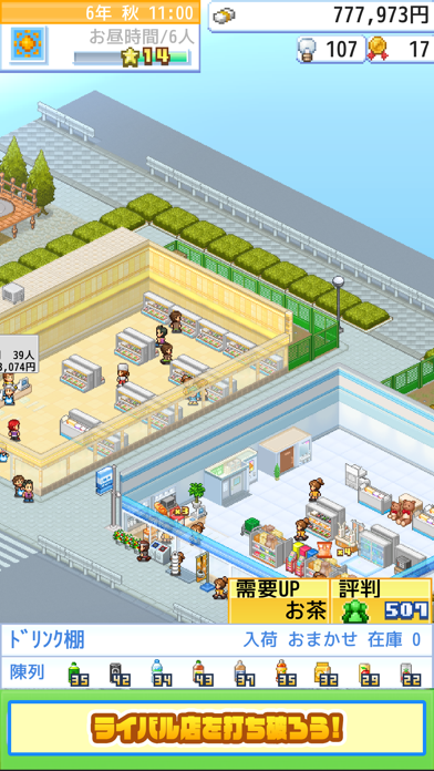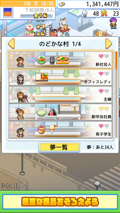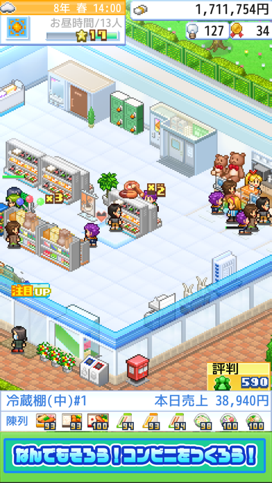 コンビニの売上が伸びると、別の町に店が出せるようになったり、商品が増えたりします。客層に合わせて品ぞろえを変え、店内の施設も充実させていくやり混み要素もあり。ミニゲームっぽさがありながらも、本格的な経営シミュレーションが楽しめるのが本アプリの魅力です。