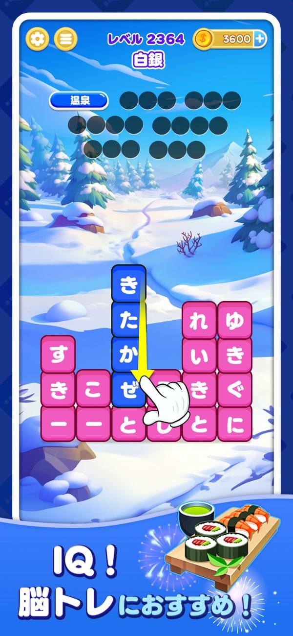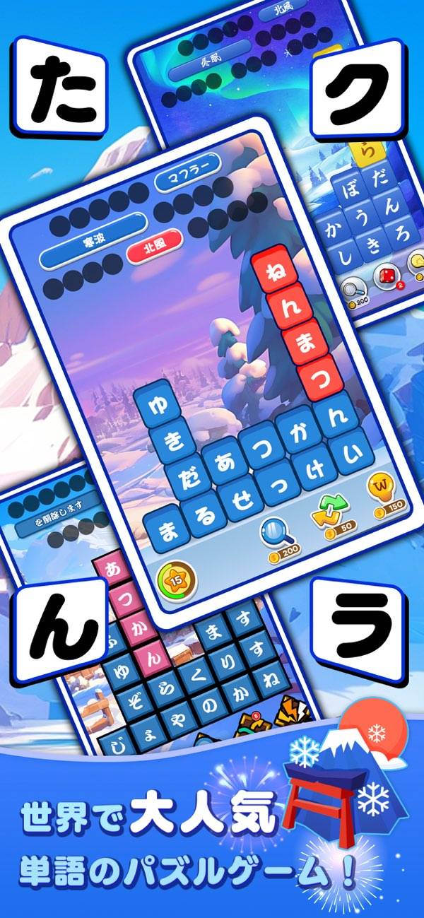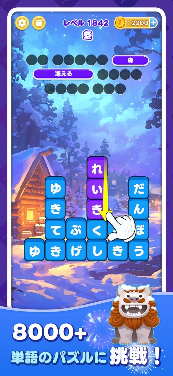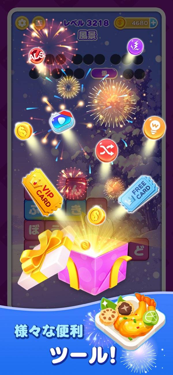 ただ単語を見つけるだけでなく、ブロックパズルや雑学の要素があるのが特徴。難しい問題でもサポートアイテムがあるので、続けるのが苦手な方におすすめです。